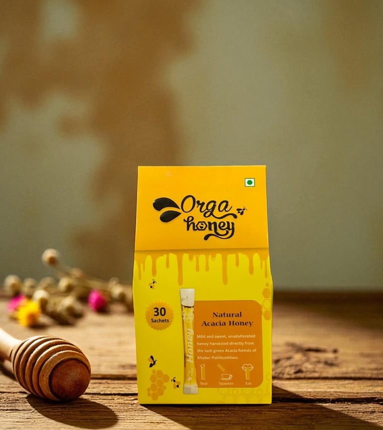 Introducing the Orgahoney Sachet Pack, designed for convenience without compromising purity. Each box contains 30 single-serve sachets, filled with 100% natural and organic Acacia honey.